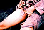 Inguinal bubo (swollen lymph node) on upper thigh of person with