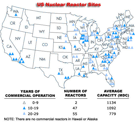 | If there were ever a clearly inadvisable place to live, it would be near a nuclear plant parked over an earthquake zone and downwind of prevailing winds from that area! The following two locator maps are from different sources and show virtually the same areas occupied by nuclear plants. The maps are generally the same except Map B shows 6 now retired facilities. There are currently 104 licensed, operating nuclear power plants in the United States (69 Pressurized Water Reactors [PWRs] and 35 [Boiling Water Reactors] BWRs), which generate about 20% of our nation's electrical use. Map B also includes general and known earthquake zones. Map A is from the NRC. Don't panic if it appears you are sitting on one. Check out the area in question yourself, but this will give you an idea, plotted along with the earthquake zones, where are the less clever places to live. |
