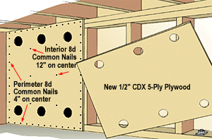 To provide adequate strength, each plywood sheet must be nailed along all edges, and along the interior studs. In most cases, the cripple wall studs are flush with the mud sill and with the "top plates" (located at the top of the cripple wall). This provides an even nailing surface for each plywood edge. However, if the cripple wall is set back from the edge of the mud sill, you will have to add blocking between the wall studs to create a nailing surface for the plywood.