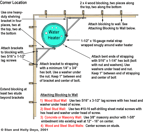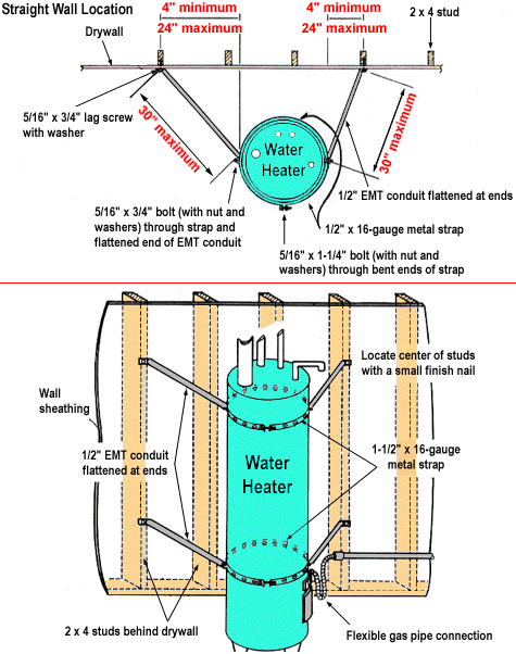 If a water heater falls during an earthquake, it could break a gas line and start a fire. To minimize this risk, add flexible connections to both the gas and water lines. To keep the water heater from toppling over, wrap it with two bands of 1-1/2" x 16-gauge perforated steel commonly known as plumberÕs tape. Connect the bands to nearby wall studs with metal struts cut to length from 1 /2" diameter wall EMT conduit. Each end of the strut is then flattened, drilled and bent at an angle to fit the wall.