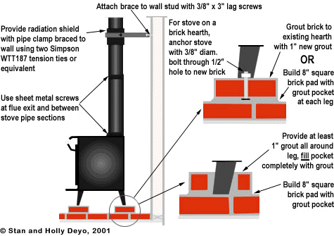 Stoves sitting on a brick hearth can be anchored using bricks and mortar. Units resting on a cement slab on grade can be anchored directly to the concrete. Stovepipes should be anchored to the flue exit, and each of the stove-pipe segments should be secured together. Mobile home approved units come with predrilled holes in the pedestals or legs and can be safely anchored to the underlying floor framing.