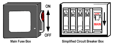 Locate the main electrical shutoff. Your house may be equipped with fuses or circuit breakers. If your house has fuses, you will find a knife switch handle (pictured left) that should be marked "MAIN." If your house has circuit breakers (pictured right), you may need to open the metal door of the breaker box to see the circuit breakers (never remove the metal cover). The main circuit breakers should be clearly marked showing on and off positions. If you have any subpanels adjacent to the main fuse or breaker panel or in other parts of the house, be safe and also shut them off in an emergency.