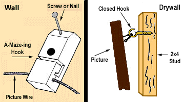 Another product is the Perfect Picture Hanging System (not shown). This industrial hook was originally used for commercial restraints, but works well when to hang very large and heavy art, pictures and mirrors. Each hook is able to handle hundreds of pounds without a problem and has a "keeper bar" that prevents the wire from jumping off or being released from the hook. A package of 5 hangers is generally about US$4.