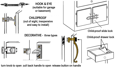 Consider where the latch will be used as some are more suitable for basement or garage use. Cabinets that are rarely opened are best suited for locks such as the child-proof slide pictured upper right. Other latches are attractive and functional making them ideal for the rest of the home. Most latches will cost US$2 - $5.