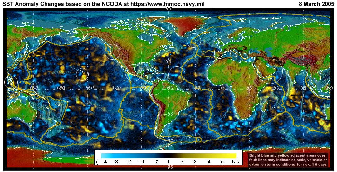 Stan's analysis shows areas of possible earthquake or volcanic activity, or extreme storm conditions for the next 1 to 5 days. Pay particular attention to areas marked by white circles. The continuous yellow line denotes plate tectonic boundaries as well as the Ring of Fire.
