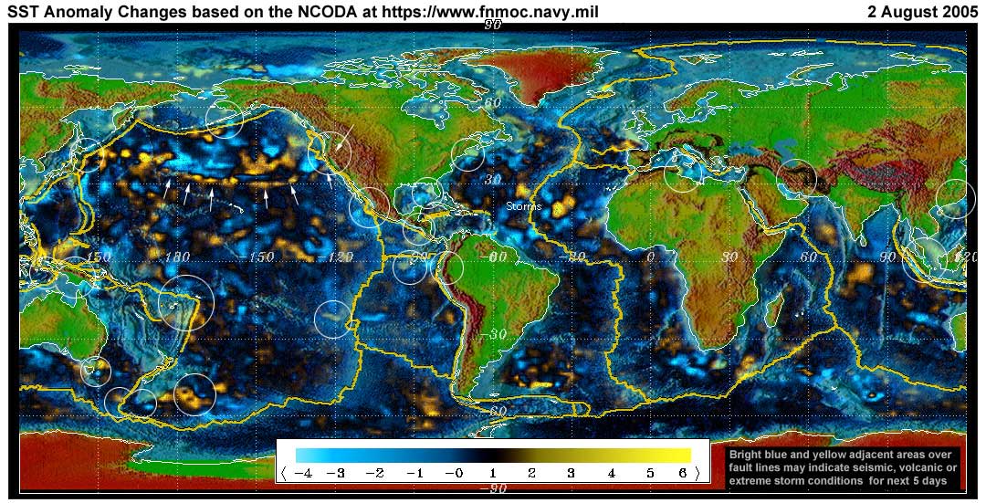 Stan's analysis shows areas of possible earthquake or volcanic activity, or extreme storm conditions for the next 1 to 5 days. Pay particular attention to areas marked by white circles. The continuous yellow line denotes plate tectonic boundaries as well as the Ring of Fire. Go to the raw data map where it is easier to see the areas of concern. Go to Stan's earthquake map archives.