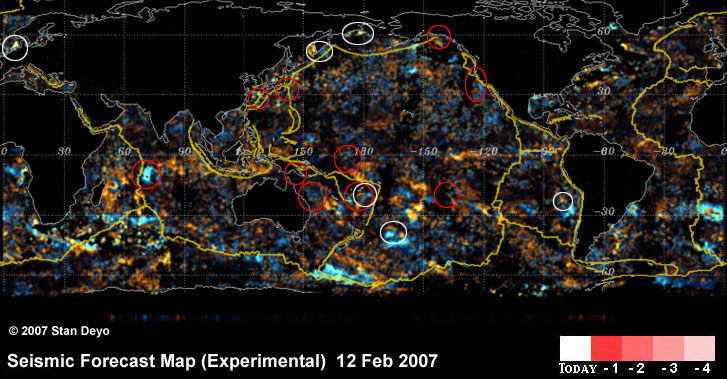 Experimental Map: Please bear with Stan as he tweaks and fine-tunes his specialized software. We will see in the ensuing days, if this proves to be a workable solution since the new source map is not as detailed as the Navy's product. Our thanks to all who offered support/suggestions since FNMOC shut down their data Nov. 12, 2006. During the past 3 months of "earthquake blindness" and clamp down on scientists speaking out on climate issues, it was interesting, though not surprising, to see elevated activity and shakers occurring in unusual places. Due to your continued encouragement and desire for these maps to continue, Stan persevered in his quest to find usable data.