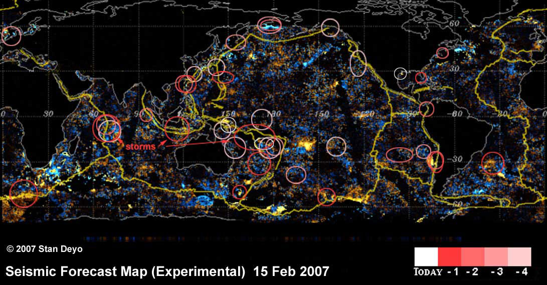Stan's seismic forecast maps are derived using SST Anomaly images from the AVHRR NOAA 17 satellite. These images are posted by the NASA Physical Oceanography Distributed Active Archive Center (PO.DAAC), at the NASA Jet Propulsion Laboratory, Pasadena, CA. 2007.