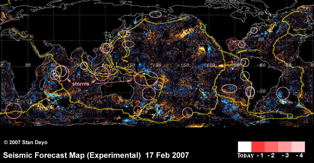 Stan's seismic forecast maps are derived using SST Anomaly images from the AVHRR NOAA 17 satellite. These images are posted by the NASA Physical Oceanography Distributed Active Archive Center (PO.DAAC), at the NASA Jet Propulsion Laboratory, Pasadena, CA. 2007.