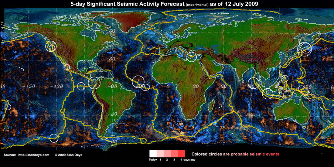 Stan's analysis shows areas of possible earthquake or volcanic activity, or extreme storm conditions for the next 1 to 5 days. Pay particular attention to areas marked by white circles. The continuous yellow line denotes plate tectonic boundaries as well as the Ring of Fire. Go to Stan's earthquake map archives.