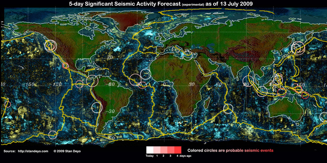 Stan's analysis shows areas of possible earthquake or volcanic activity, or extreme storm conditions for the next 1 to 5 days. Pay particular attention to areas marked by white circles. The continuous yellow line denotes plate tectonic boundaries as well as the Ring of Fire. Go to Stan's earthquake map archives.