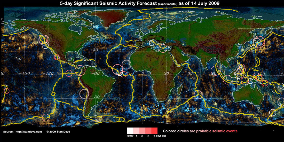 Stan's analysis shows areas of possible earthquake or volcanic activity, or extreme storm conditions for the next 1 to 5 days. Pay particular attention to areas marked by white circles. The continuous yellow line denotes plate tectonic boundaries as well as the Ring of Fire. Go to Stan's earthquake map archives.