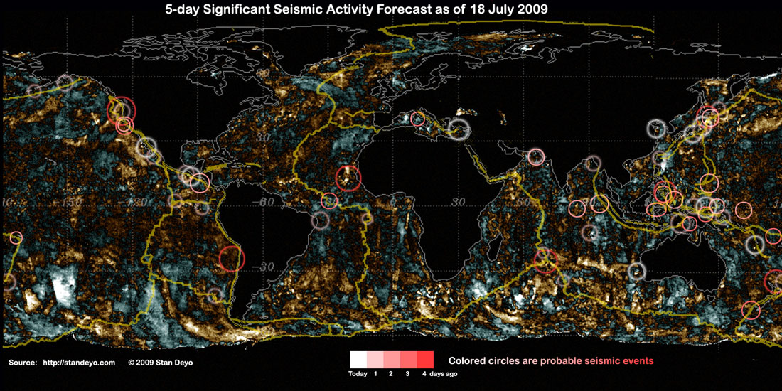 Stan's analysis shows areas of possible earthquake or volcanic activity, or extreme storm conditions for the next 1 to 5 days. Pay particular attention to areas marked by white circles. The continuous yellow line denotes plate tectonic boundaries as well as the Ring of Fire. Go to Stan's earthquake map archives.