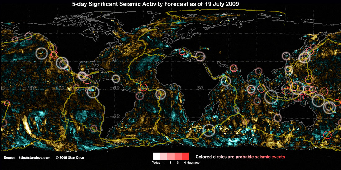 Stan's analysis shows areas of possible earthquake or volcanic activity, or extreme storm conditions for the next 1 to 5 days. Pay particular attention to areas marked by white circles. The continuous yellow line denotes plate tectonic boundaries as well as the Ring of Fire. Go to Stan's earthquake map archives.