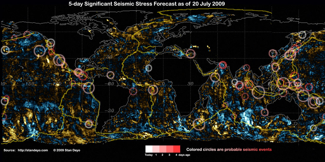 Stan's analysis shows areas of possible earthquake or volcanic activity, or extreme storm conditions for the next 1 to 5 days. Pay particular attention to areas marked by white circles. The continuous yellow line denotes plate tectonic boundaries as well as the Ring of Fire. Go to Stan's earthquake map archives.