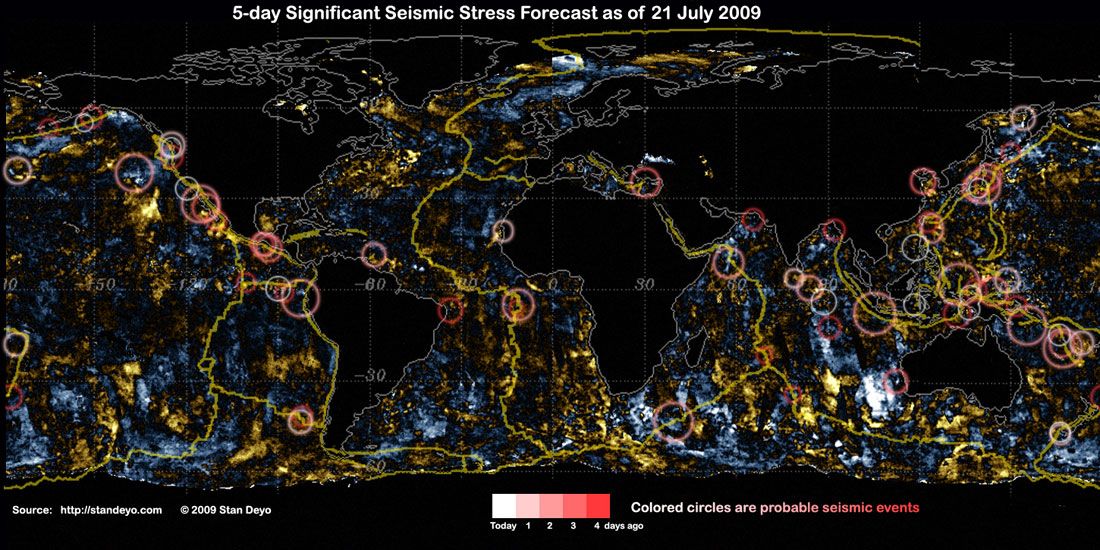 Stan's analysis shows areas of possible earthquake or volcanic activity, or extreme storm conditions for the next 1 to 5 days. Pay particular attention to areas marked by white circles. The continuous yellow line denotes plate tectonic boundaries as well as the Ring of Fire. Go to Stan's earthquake map archives.