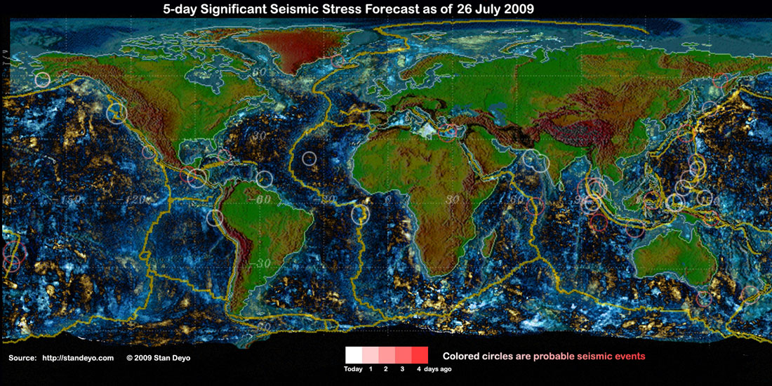 Stan's analysis shows areas of possible earthquake or volcanic activity, or extreme storm conditions for the next 1 to 5 days. Pay particular attention to areas marked by white circles. The continuous yellow line denotes plate tectonic boundaries as well as the Ring of Fire. Go to Stan's earthquake map archives.