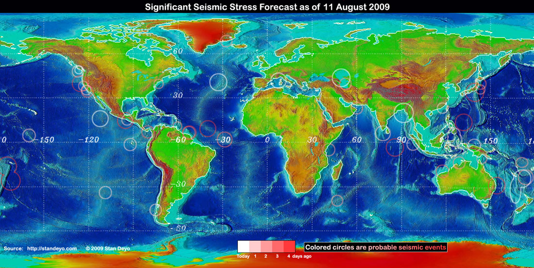 Stan's analysis shows areas of possible earthquake or volcanic activity, or extreme storm conditions for the next 1 to 5 days. Pay particular attention to areas marked by white circles. The continuous yellow line denotes plate tectonic boundaries as well as the Ring of Fire. Go to Stan's earthquake map archives.
