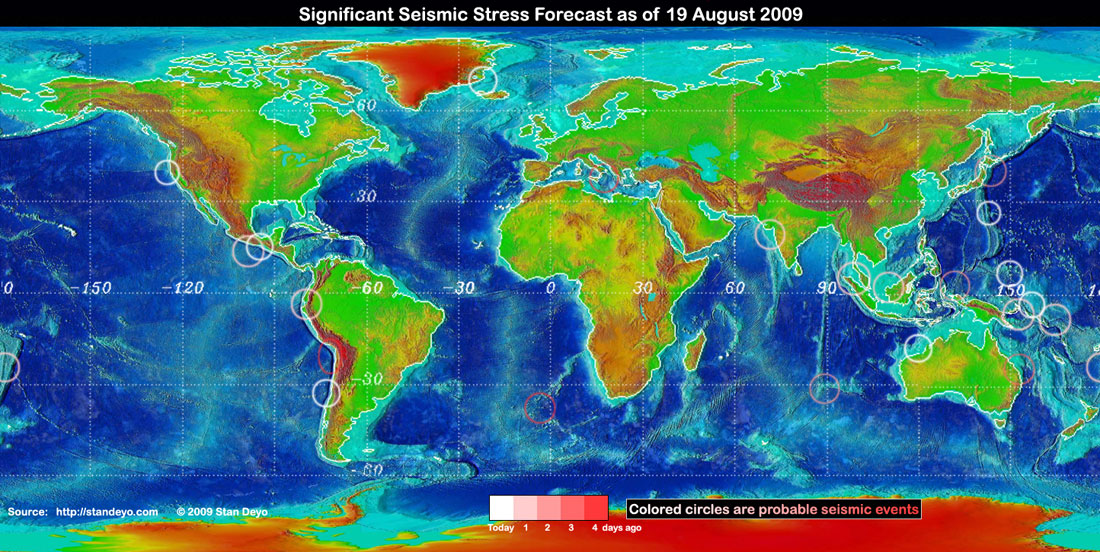 Stan's analysis shows areas of possible earthquake or volcanic activity, or extreme storm conditions for the next 1 to 5 days. Pay particular attention to areas marked by white circles. The continuous yellow line denotes plate tectonic boundaries as well as the Ring of Fire. Go to Stan's earthquake map archives.