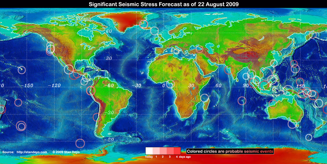 Stan's analysis shows areas of possible earthquake or volcanic activity, or extreme storm conditions for the next 1 to 5 days. Pay particular attention to areas marked by white circles. The continuous yellow line denotes plate tectonic boundaries as well as the Ring of Fire. Go to Stan's earthquake map archives.