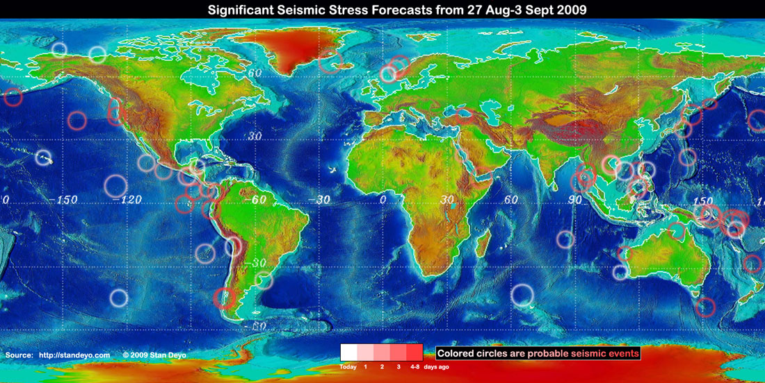 Stan's analysis shows areas of possible earthquake or volcanic activity, or extreme storm conditions for the next 1 to 5 days. Pay particular attention to areas marked by white circles. The continuous yellow line denotes plate tectonic boundaries as well as the Ring of Fire. Go to Stan's earthquake map archives. Map explained.