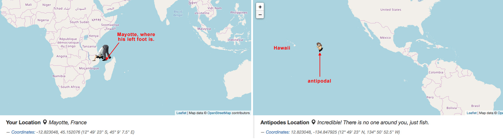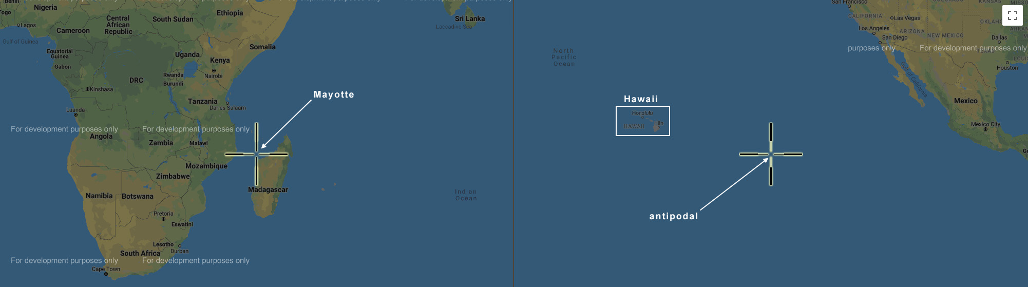 We like the first because it's easier to use a little bit. See Mayotte's antipodal on this map. The second is good because it gives long/lat. See Mayotte's antipodal on this map.