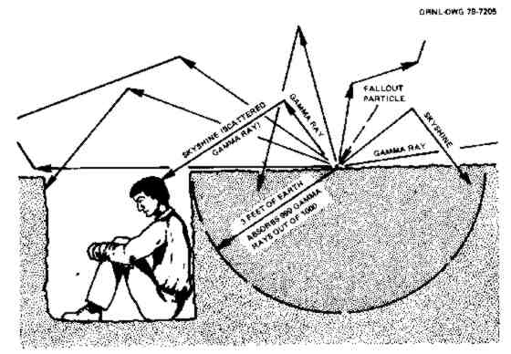 However, the man in the trench would not be protected from "skyshine," which is caused by gamma rays scattering after striking the nitrogen,oxygen, and other atoms of the air. The man's exposed head, which is just below ground level, would be hit by about one-tenth as many gamma rays as if it were 3 feet above ground (Fig. 5.3). Even if all fallout could be kept out of the trench and off the man and every part of the ground within 3 feet of the edges of the trench, skyshine from heavy fallout on the surrounding ground could deliver a fatal radiation dose to the man in the open trench.