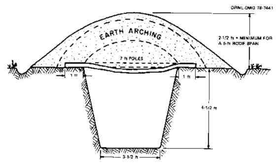 Several types of expedient shelters can be made to withstand greater pressures if their roofs are built of yielding materials and covered with enough earth to attain "earth arching." This arching results when the yielding of the roof causes part of the load carried by the roof to be shifted to the overlying earth particles, which become rearranged in such a way that an arch is formed. This arch carries the load to surrounding supports that are less yielding. These supports often include adjacent earth that has not been disturbed.