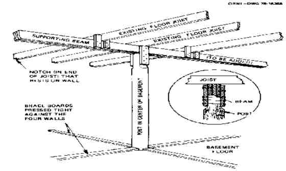 Fig. 5.8. Supporting beam and one of its posts installed to increase the load of shielding material that can be carried safely by the floor above a home basement.