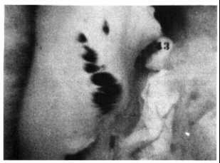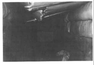 Shore earth walls to prevent their caving in as a result of ground shock and earth pressure. Most unshored (that is, unsupported) earth walls are partially collapsed by ground shock at much lower blast overpressures than those at which a flexible roof protected by earth arching is damaged. Figure D.5 is a picture of a seated dummy taken by a high-speed movie camera mounted inside an unshored, Pole- Covered Trench Shelter of the Russian type tested at the 20-psi range. (A second dummy was obscured by blast-torn curtains made of blankets.) The shelter had an open stairway entryway, positioned at right angles to the stand-up-height trench and facing away from the targeted "city" so as to minimize the entry of blast waves and blast wind.
