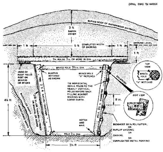 *In loose, unstable earth such as sand, the walls of all underground shelters must be shored. First, an oversized trench must be dug with gently sloping sides. Next, the shoring is built, often as a freestanding, roofless structure. Then earth must be backfilled around the shoring to a level a few inches higher than the uppermost parts of the shoring, as in Fig. D.7. Finally, the roof poles or planks must be placed so that they are supported only by the backfilled earth. Blast tests have indicated that a Pole-Covered Trench Shelter thus proportioned and lightly shored should protect its occupants against disastrous collapse of its walls at overpressure ranges up to 15 psi.
