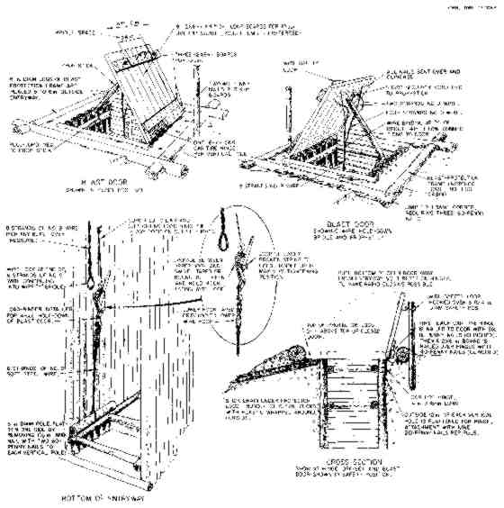 Equipped with blast doors each made of 5 sheets of 3/4-inch exterior plywood (see Fig. D.15) bonded with resin glue and nailed together with 4-1/2 in. nails. The nails should be driven on 4-in. spacings and their protruding ends should be clinched (bent over). The blast doors must be secured against being yanked open by negative pressure ("suction") by securing them with a strong wire bridle (see Fig.-D.14), and with the lower, fixed wire strongly connected near the bottom of the entry to all of the vertical poles on one side, as shown in Fig. D.14.