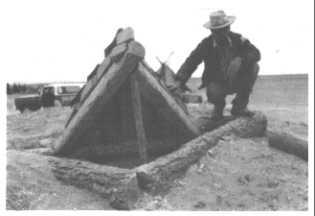 *The vertical part of a triangular entry: The lower section of the vertical part is made in a similar manner to the horizontal shelter shown in Fig. D.9. Figure D.10 shows 4-1/2 foot horizontal poles (1) forming a "V", with one end of each pole laid on top of the adjacent lower pole. The other ends of these poles (1) are pressed against the two pairs of vertical posts (2). (After this photo was taken, the tops of these two pairs of vertical posts were sawed off as shown in Fig. D.11.) The 4-1/2-foot horizontal poles (1) were kept level by the short spacer-poles (3) that were wired or nailed in place.
