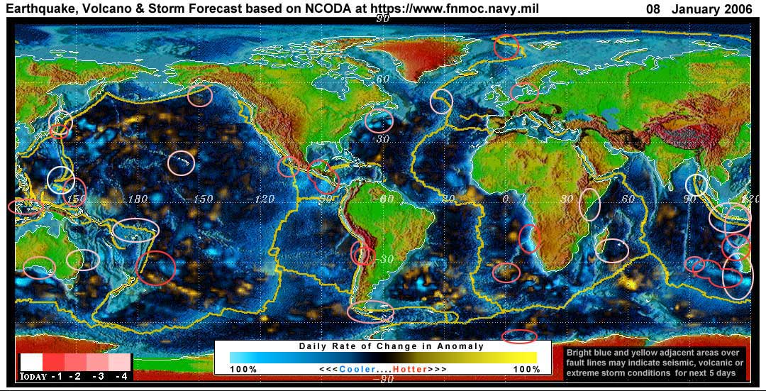 Stan's analysis shows areas of possible earthquake or volcanic activity, or extreme storm conditions for the next 1 to 5 days. Pay particular attention to areas marked by white circles. The continuous yellow line denotes plate tectonic boundaries as well as the Ring of Fire. Go to the raw data map where it is easier to see the areas of concern. Go to Stan's earthquake map archives.