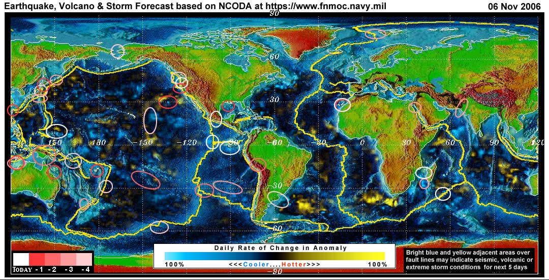Stan's analysis shows areas of possible earthquake or volcanic activity, or extreme storm conditions for the next 1 to 5 days. Pay particular attention to areas marked by white circles. The continuous yellow line denotes plate tectonic boundaries as well as the Ring of Fire. Go to the raw data map where it is easier to see the areas of concern. Go to Stan's earthquake map archives.