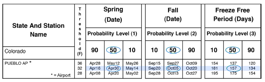 It's mid-February and we'll start seeds indoors in 2 weeks. By looking at NOAA's long-range forecast and using the county level frost charts in Garden Gold: Grow Maximum Veggies With Minimum Effort, we see that's a good time to start. These charts for all 50 states down to the county level and give 3 levels for first and last frosts. Frost occurring with 90%, 50% and 10% probabilities. For example, it shows it's pretty safe to plant in Pueblo County by April 30 with a 50-50 chance of frost and only 10% by May 14. This is a great way to jump start veggies.