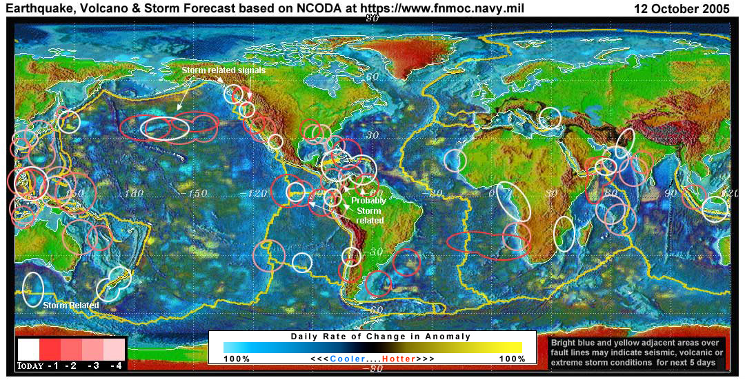 DEYO NOTES: For earthquake maps, see the USGS "shake maps" (click anywhere on the global map for a closer view). For quakes USGS may not list, go to the European-Mediterranean Seismological Center's map and scroll to the bottom of the page for a global view. You can compare these maps for the next 5 days to Stan's NCODA maps, to see the hits of his seismic target zones (white circles).