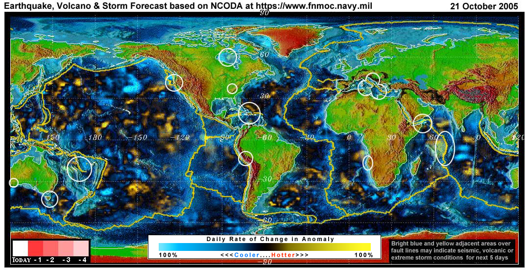 Stan's analysis shows areas of possible earthquake or volcanic activity, or extreme storm conditions for the next 1 to 5 days. Pay particular attention to areas marked by white circles. The continuous yellow line denotes plate tectonic boundaries as well as the Ring of Fire. Go to the raw data map where it is easier to see the areas of concern. Go to Stan's earthquake map archives.