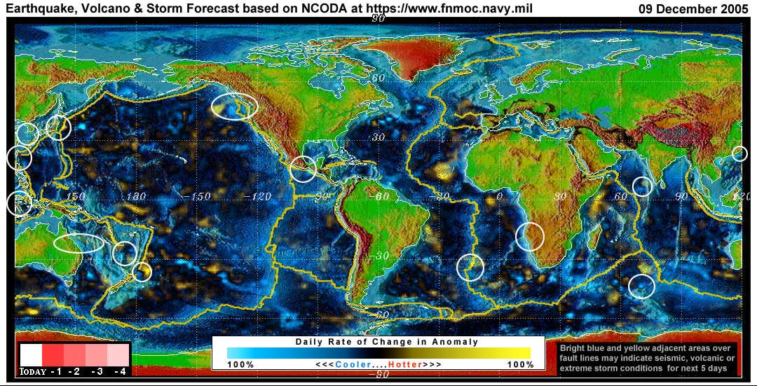Stan's analysis shows areas of possible earthquake or volcanic activity, or extreme storm conditions for the next 1 to 5 days. Pay particular attention to areas marked by white circles. The continuous yellow line denotes plate tectonic boundaries as well as the Ring of Fire. Go to the raw data map where it is easier to see the areas of concern. Go to Stan's earthquake map archives.