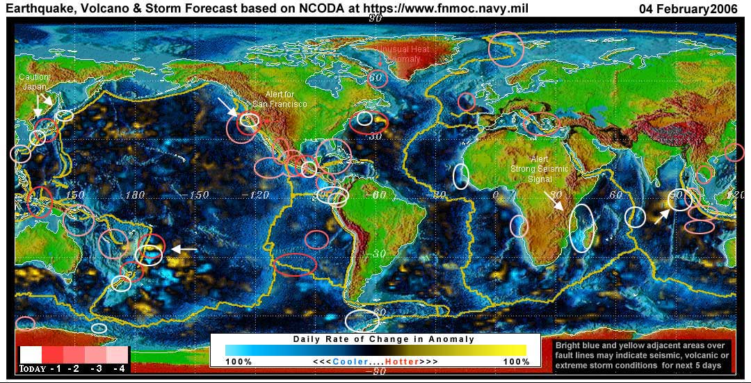 DEYO NOTES: For earthquake maps, see the USGS "shake maps" (click anywhere on the global map for a closer view). For quakes USGS may not list, go to the European-Mediterranean Seismological Center's map and scroll to the bottom of the page for a global view. You can compare these maps for the next 5 days to Stan's NCODA maps, to see the hits of his seismic target zones (white circles).
