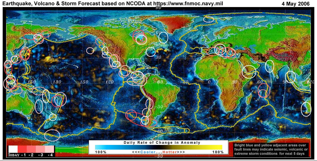 Stan's analysis shows areas of possible earthquake or volcanic activity, or extreme storm conditions for the next 1 to 5 days. Pay particular attention to areas marked by white circles. The continuous yellow line denotes plate tectonic boundaries as well as the Ring of Fire. Go to the raw data map where it is easier to see the areas of concern. Go to Stan's earthquake map archives.