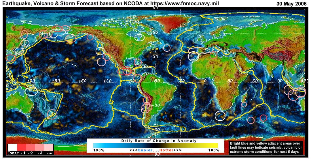 Stan's analysis shows areas of possible earthquake or volcanic activity, or extreme storm conditions for the next 1 to 5 days. Pay particular attention to areas marked by white circles. The continuous yellow line denotes plate tectonic boundaries as well as the Ring of Fire. Go to the raw data map where it is easier to see the areas of concern. Go to Stan's earthquake map archives.