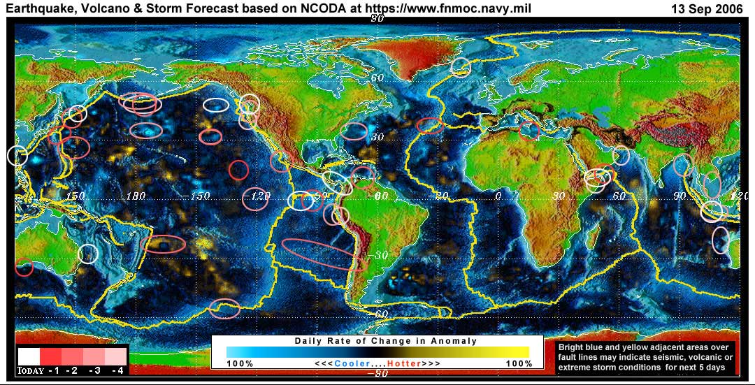 Stan's analysis shows areas of possible earthquake or volcanic activity, or extreme storm conditions for the next 1 to 5 days. Pay particular attention to areas marked by white circles. The continuous yellow line denotes plate tectonic boundaries as well as the Ring of Fire. Go to the raw data map where it is easier to see the areas of concern. Go to Stan's earthquake map archives.