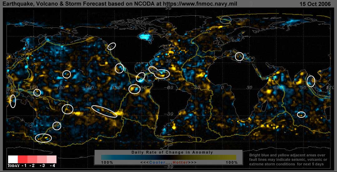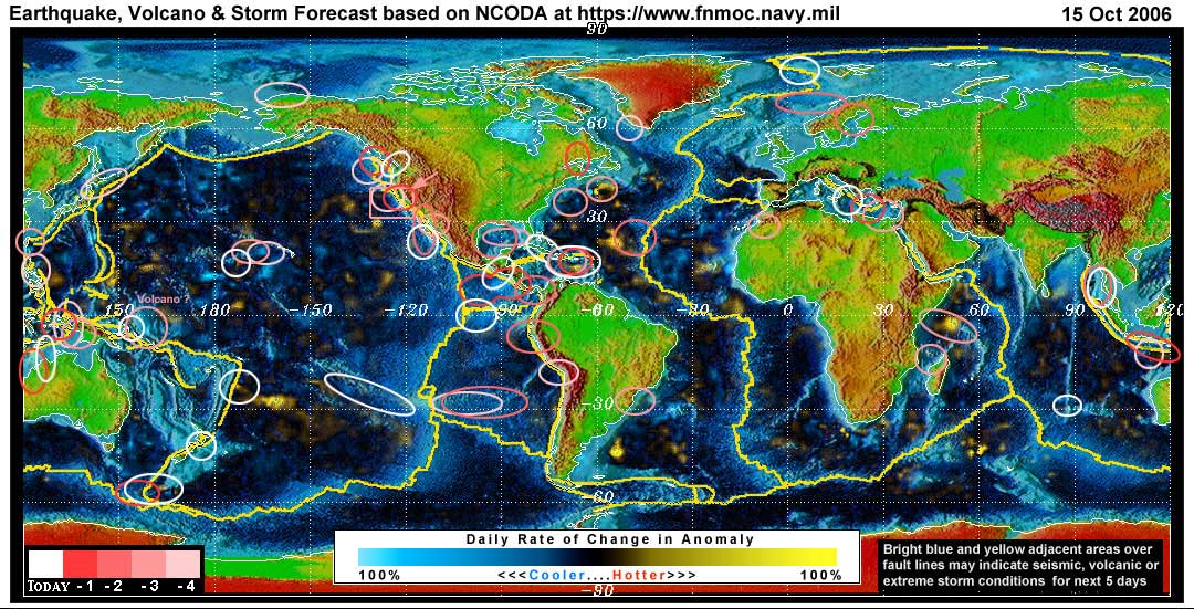 Stan's analysis shows areas of possible earthquake or volcanic activity, or extreme storm conditions for the next 1 to 5 days. Pay particular attention to areas marked by white circles. The continuous yellow line denotes plate tectonic boundaries as well as the Ring of Fire. Go to the raw data map where it is easier to see the areas of concern. Go to Stan's earthquake map archives.