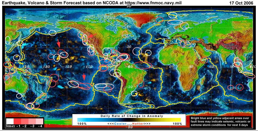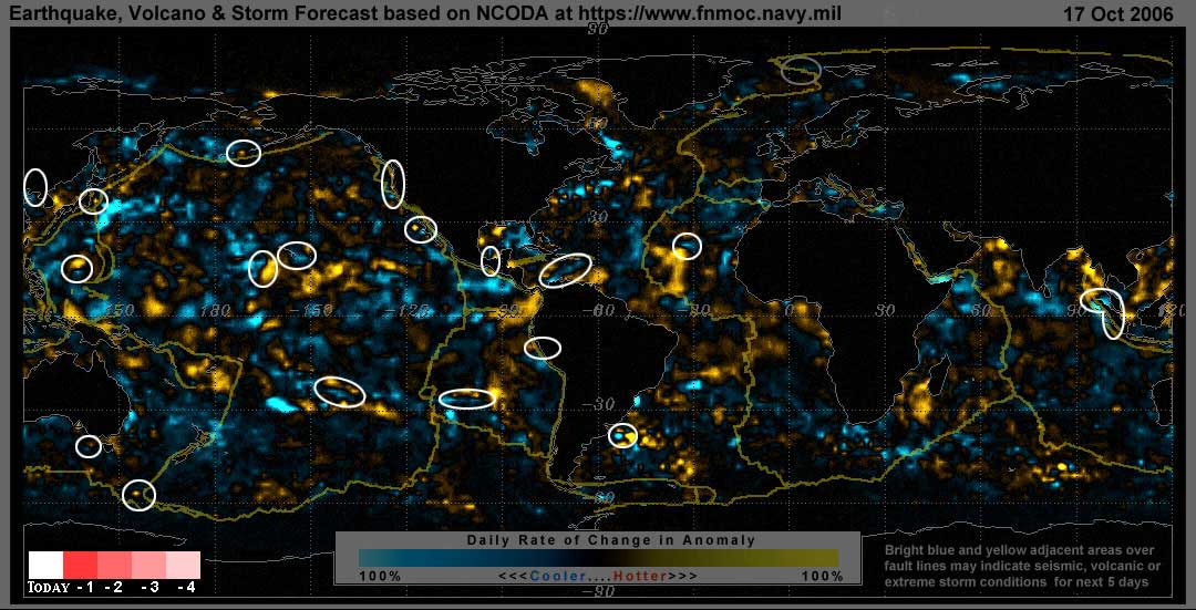 Stan's analysis shows areas of possible earthquake or volcanic activity, or extreme storm conditions for the next 1 to 5 days. Pay particular attention to areas marked by white circles. The continuous yellow line denotes plate tectonic boundaries as well as the Ring of Fire. Go to the raw data map where it is easier to see the areas of concern. Go to Stan's earthquake map archives.