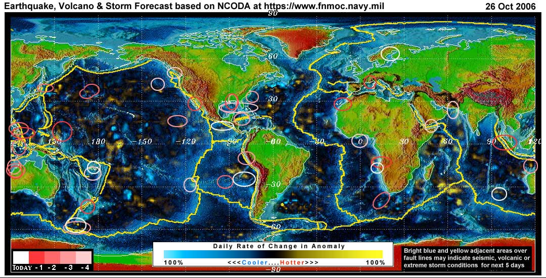 Stan's analysis shows areas of possible earthquake or volcanic activity, or extreme storm conditions for the next 1 to 5 days. Pay particular attention to areas marked by white circles. The continuous yellow line denotes plate tectonic boundaries as well as the Ring of Fire. Go to the raw data map where it is easier to see the areas of concern. Go to Stan's earthquake map archives.