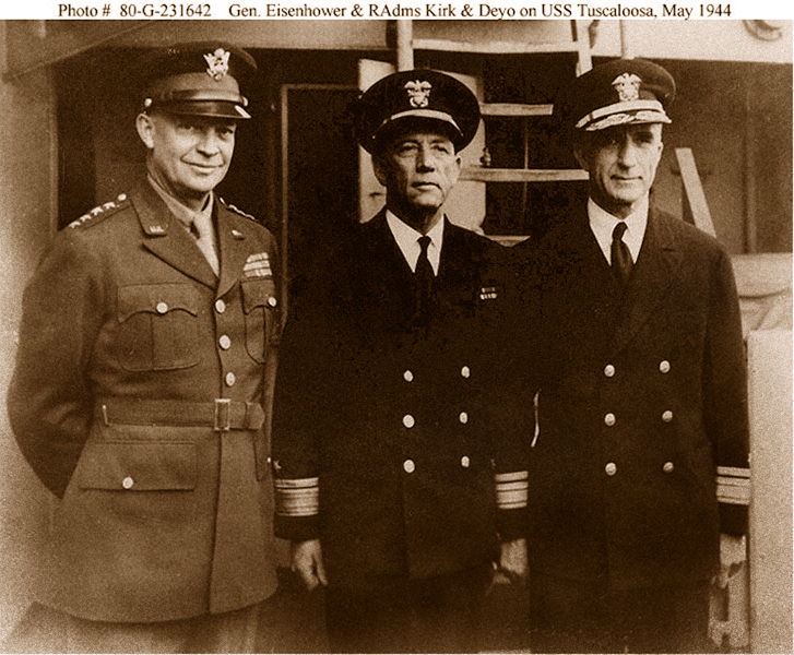 | USS Deyo (DD-989) was named for Vice Admiral Morton L. Deyo (1887-1973), a veteran destroyerman and distinguished naval gunfire support task force commander of World War II. Photo #: 80-G-231642. General Dwight D. Eisenhower, U.S. Army (left), with Rear Admiral Alan G. Kirk, USN (center) and Rear Admiral Morton L. Deyo, USN on board USS Tuscaloosa (CA-37) on 19 May 1944, during preparations for the Normandy invasion. Official U.S. Navy Photograph, now in the collections of the National Archives. |