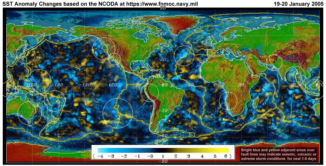 Stan's analysis shows areas of possible earthquake or volcanic activity, or extreme storm conditions for the next 1 to 5 days. Pay particular attention to areas marked by white circles. The continuous yellow line denotes plate tectonic boundaries as well as the Ring of Fire.
